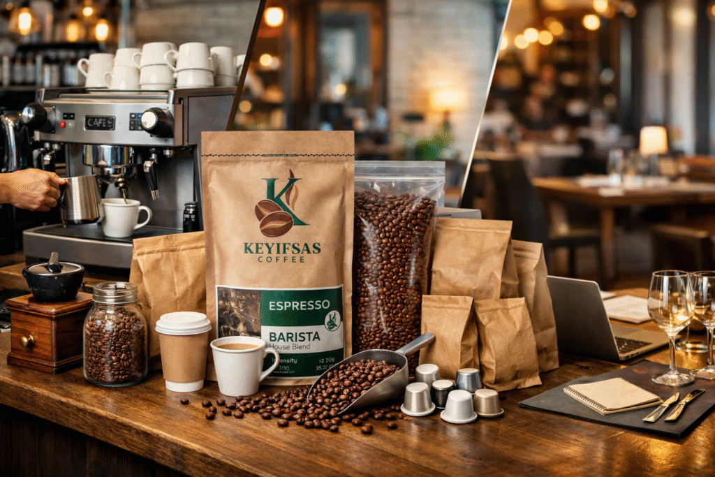 Keyifsas Coffee, kafe, lokanta ve ofislerin kahve ihtiyaçlarını kaliteli ve sürdürülebilir bir tedarik anlayışıyla karşılar. Espresso, filtre ve Türk kahvesi ürünlerimizi işletmelere özel toptan çözümlerle sunar.